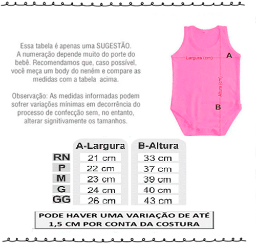 Medidas: Pode haver pequenas variações devido ao processo de costura.