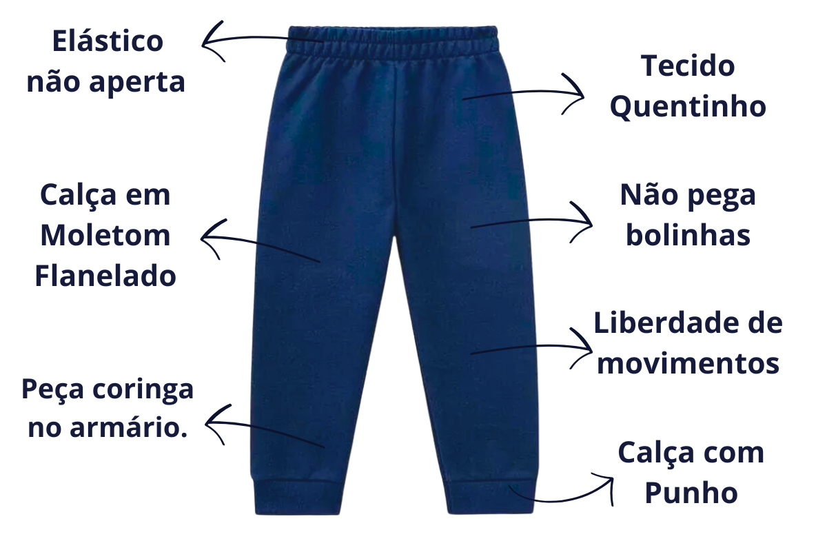 Ideal para dias frescos, atividades escolares ou momentos de descontração em casa. A calça de moletom Basikinho é a escolha prática para pais que buscam qualidade e as crianças que merecem o melhor em conforto.