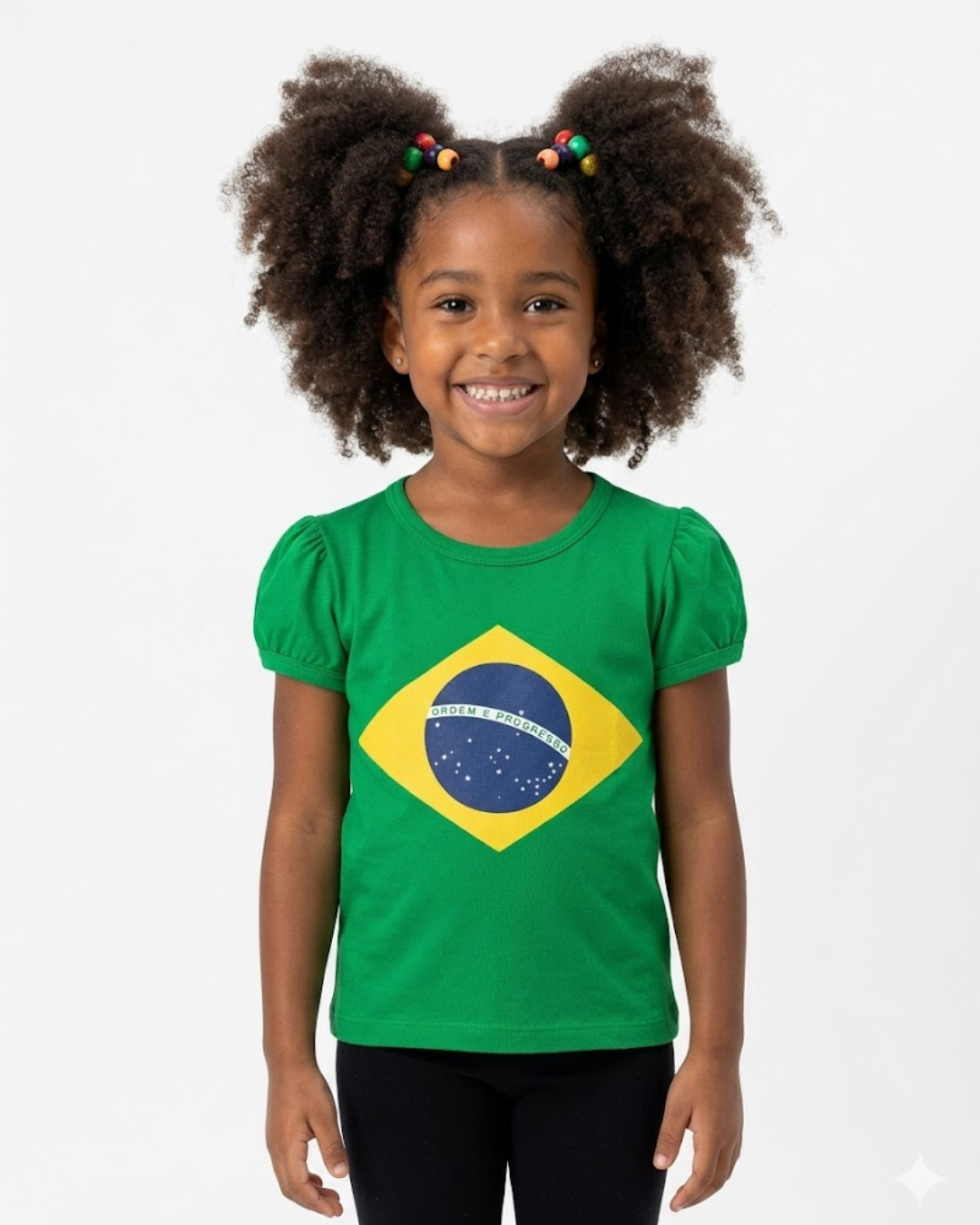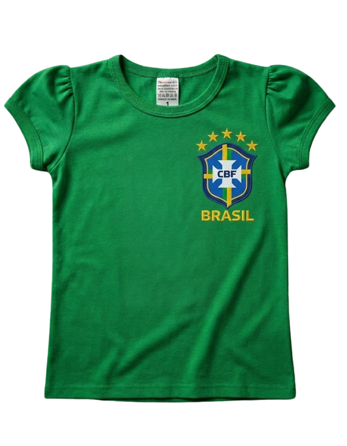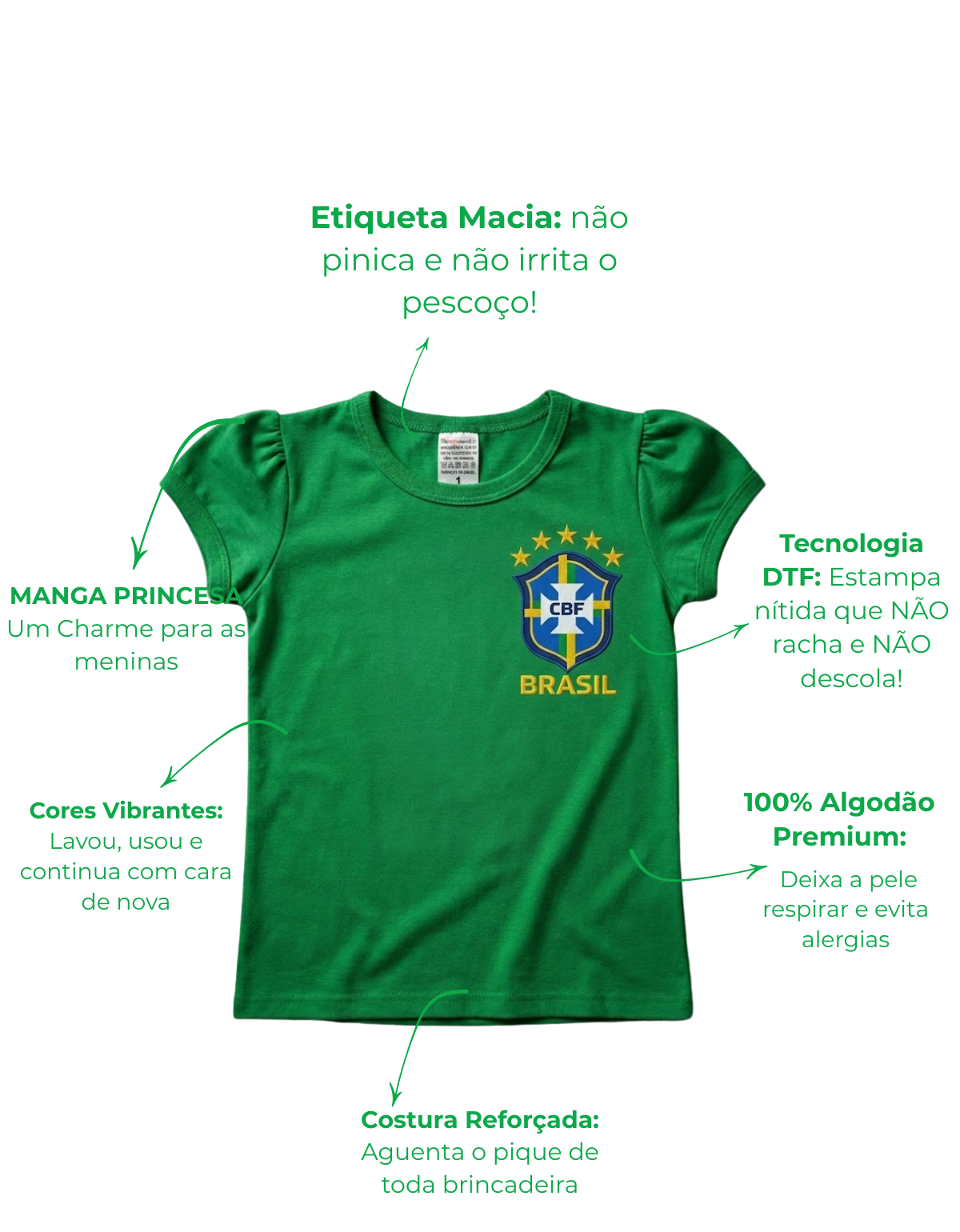 Prepare sua pequena torcedora para vibrar pelo Brasil com muito estilo e conforto! Esse conjunto une a delicadeza da manga princesa (bufante) com a praticidade da calça legging, ideal para dias de jogos, festas escolares e álbuns de figurinhas.